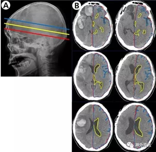 该研究收集作者所在单位2011年至2015年接受手术治疗的自发性脑出血患者。研究对象的血肿位于幕上单侧大脑半球;根据术前和术后3个月在头颅CT轴位3个平面,即室间孔平面、透明隔平面和侧脑室平面上的影像片(图1)